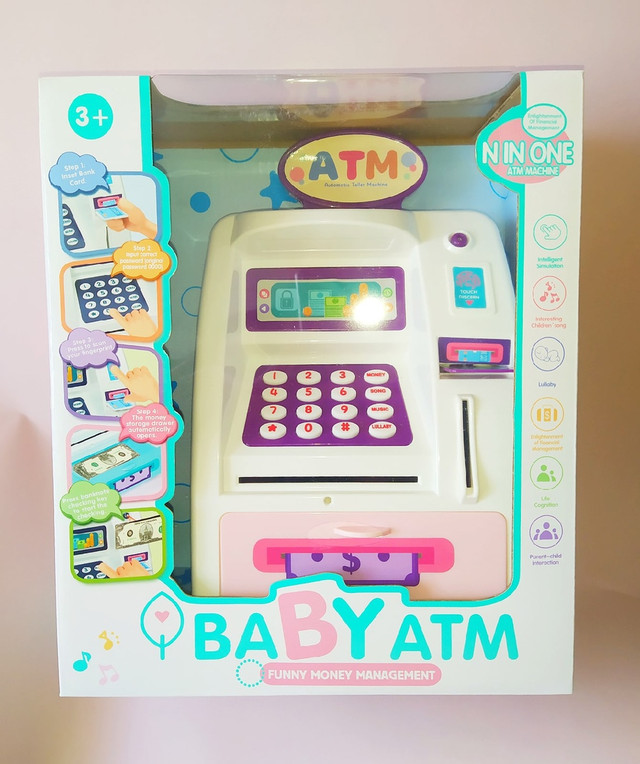 Детская копилка сейф + банкомат с купюроприемником будет отличным подарком для Вашего малыша. С помощью сейфа Вы сможете научить ребенка обращаться с деньгами. В сейфе имеется отверстие для монет и купюроприемник, который работает как настоящий. Если малышу понадобится вынуть деньги из копилки, то ему необходимо вставить банковскую карту и набрать код из 4-х цифр (по умолчанию 0000), внизу выдаст банкомат деньги. Детская копилка сейф + банкомат с купюроприемником работает от 3-х батареек типа АА (в комплект не входят).